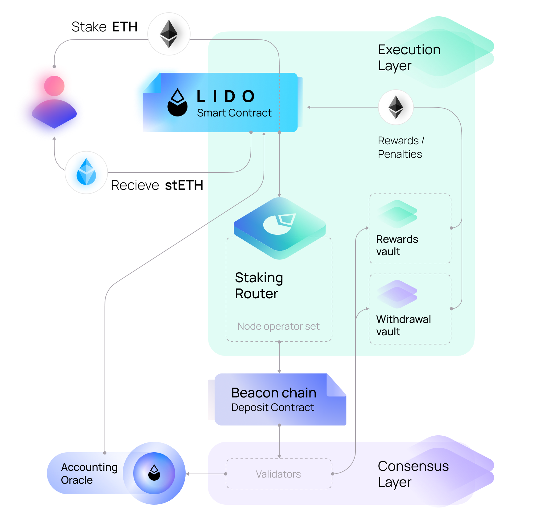 Users do not select specific modules or node operators for staking. Once the Lido Buffer accumulates enough ETH, the Staking Router automatically allocates it to validators. The router distributes ETH across the connected staking modules — Curated Registry Module, Community Staking Module (CSM), and Simple Distributed Validator Technology (SimpleDVT) — following the programmatic allocation rules defined within the Lido smart contracts.