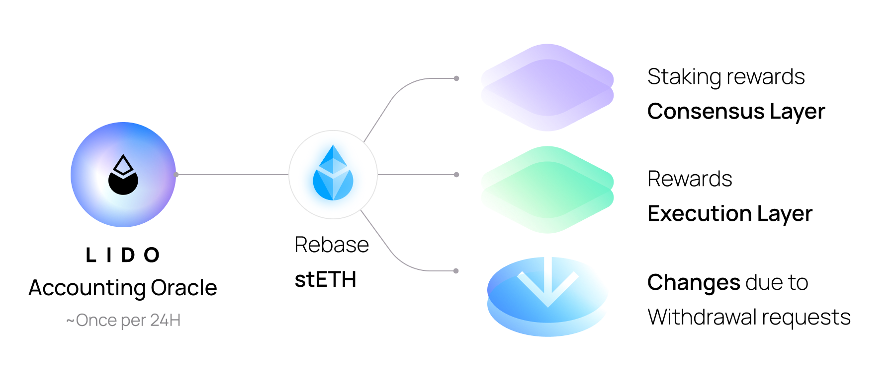 The Lido oracle mechanisms are responsible for maintaining the connection between the Execution Layer and Consensus Layer portions of the Lido protocol. As a part of this set of activities, oracles synchronize data between the Execution and Consensus Layers, reflecting validator rewards and penalties for stETH holders via the daily rebase mechanism.